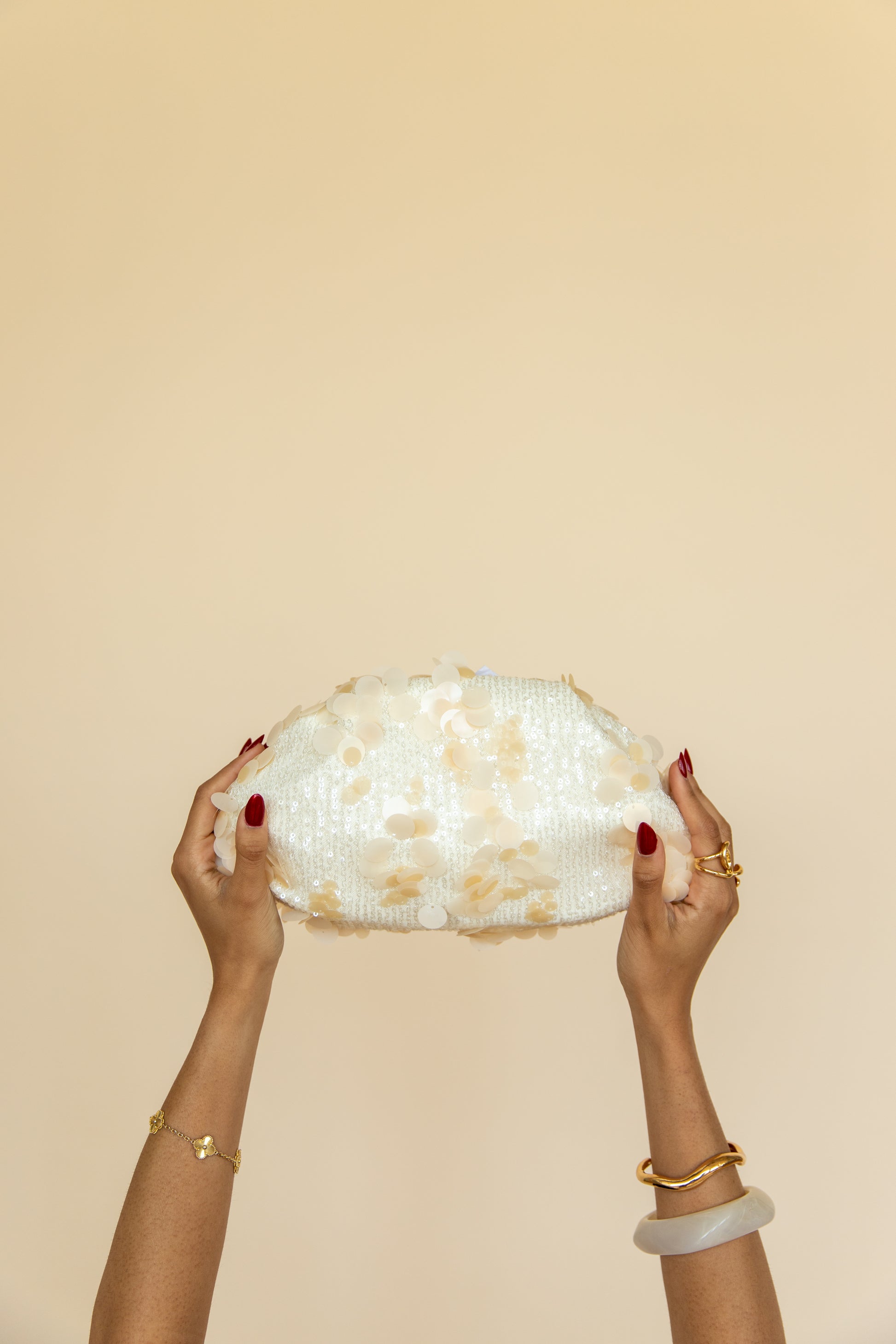 Get ready to make a statement with The Naples Clutch! This light cream dumpling bag is sure to turn heads with its shimmering sequins. Perfect for a night out, this clutch will add a touch of glamour to any outfit.