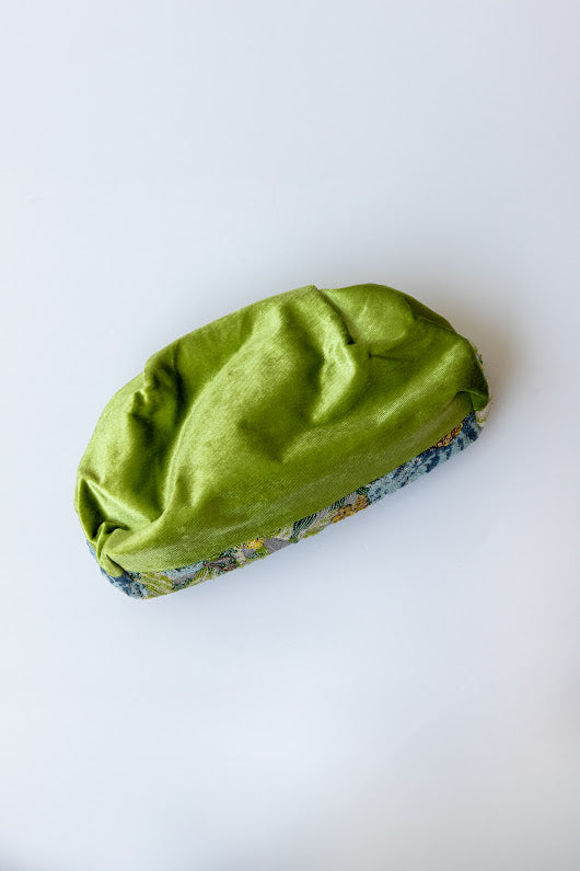 This green sequin dumping purse is adorned with whimsical blue and green flowers, making it the perfect accessory to carry your essentials with style.