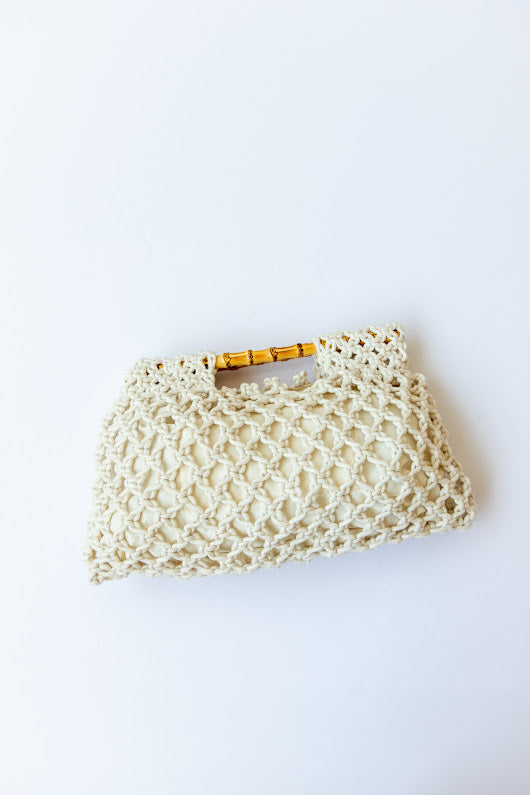Carry your essentials in style with The Woven Clutch. This clutch features a bamboo handle and a spacious interior that can hold all your belongings. Perfect for any occasion, this clutch adds a touch of whimsy to any outfit.